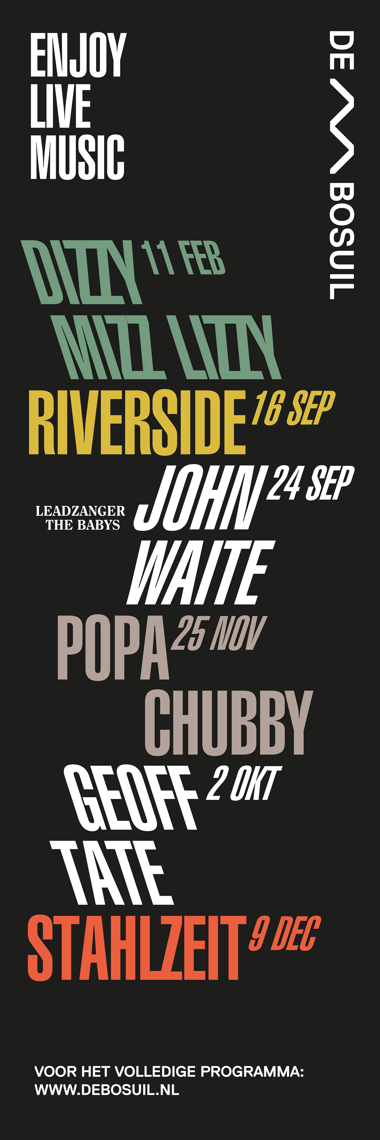 Hét poppodium van Weert! Begonnen als jongerenclub in de jaren ’60 en inmiddels uitgegroeid tot volwaardig poppodium. Na de verbouwing in 2022 biedt het plaats voor 800 bezoekers. Wij maakten een nieuwe visuele identiteit, die gelijk met de heropening van het gebouw gepresenteerd werd. In de vorm kun je de B zien van bosuil, de M van muziek en de W van Weert. De liggende variant van het logo symboliseert ook een vliegende uil. Door de vorm te herhalen krijg je ook de associatie met geluidsgolven. Voor deze identiteit maakten speciaal een ‘backslanted’ lettertype.