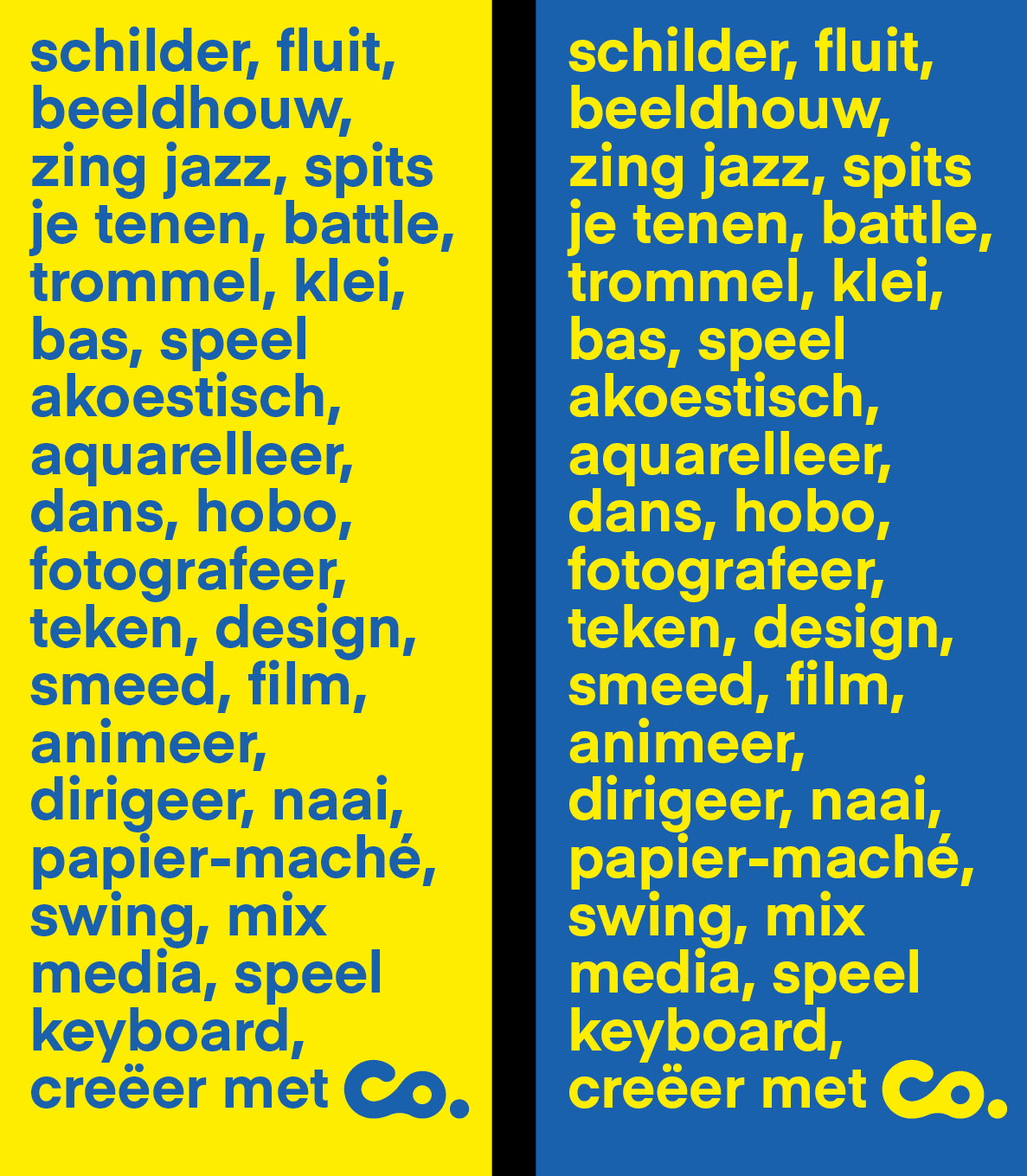 Co. de Cultuurontwikkelaar. Ook bekend als het voormalige Kunstencentrum Venlo, maar dan met nieuwe ambities, nieuwe rollen en dus een nieuwe naam. Als netwerkorganisatie stimuleert Co. de actieve deelname aan kunst en cultuur in Noord-Limburg. Voor mensen die hun creatieve talenten in de vrije tijd willen ontwikkelen op het gebied van dans, muziek, mode of beeldende kunsten. Dit alles vanuit de wetenschap dat actieve kunst- en cultuurbeoefening niet alleen zorgt voor een fijnere samenleving maar ook voor een plezieriger leven.
