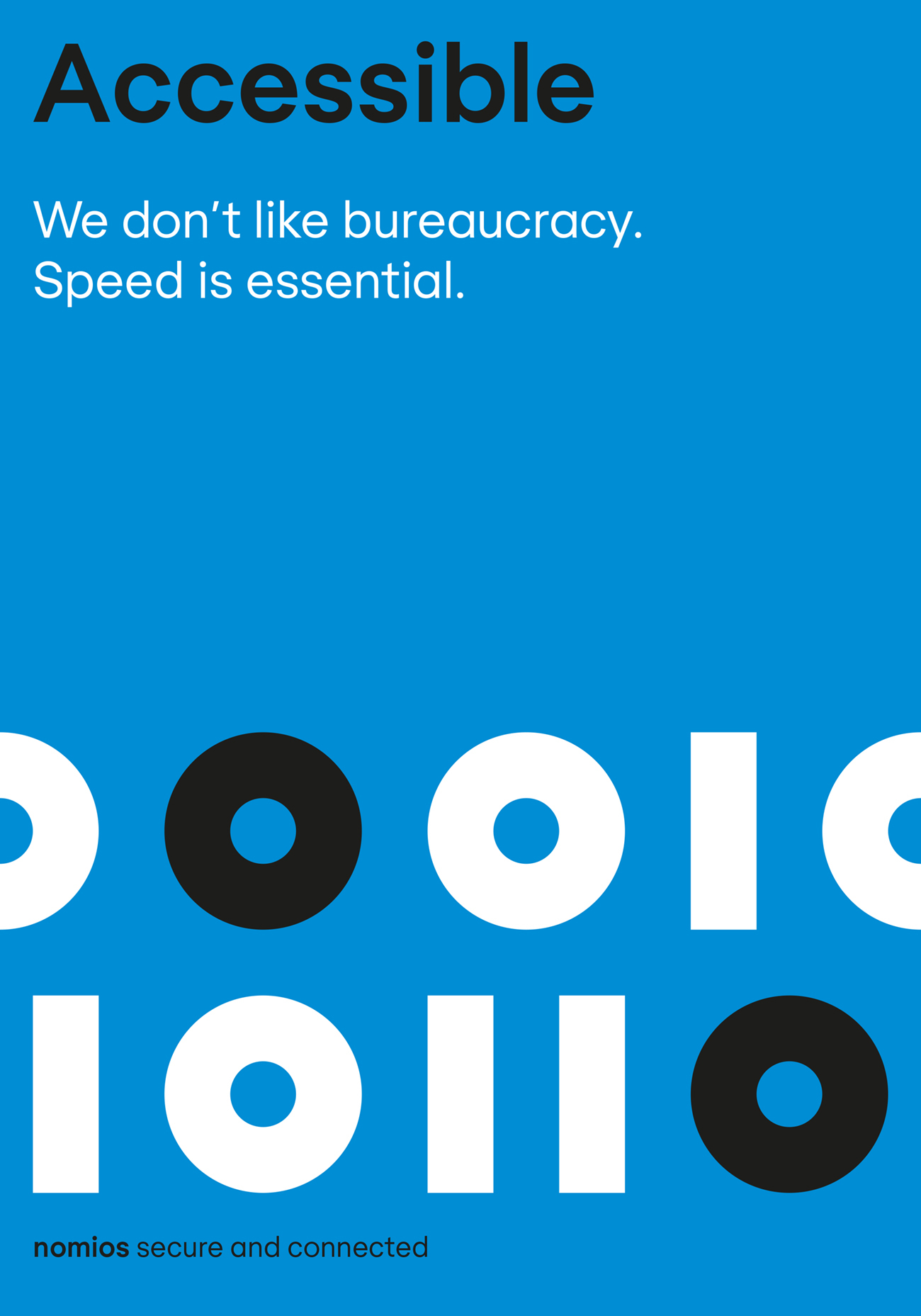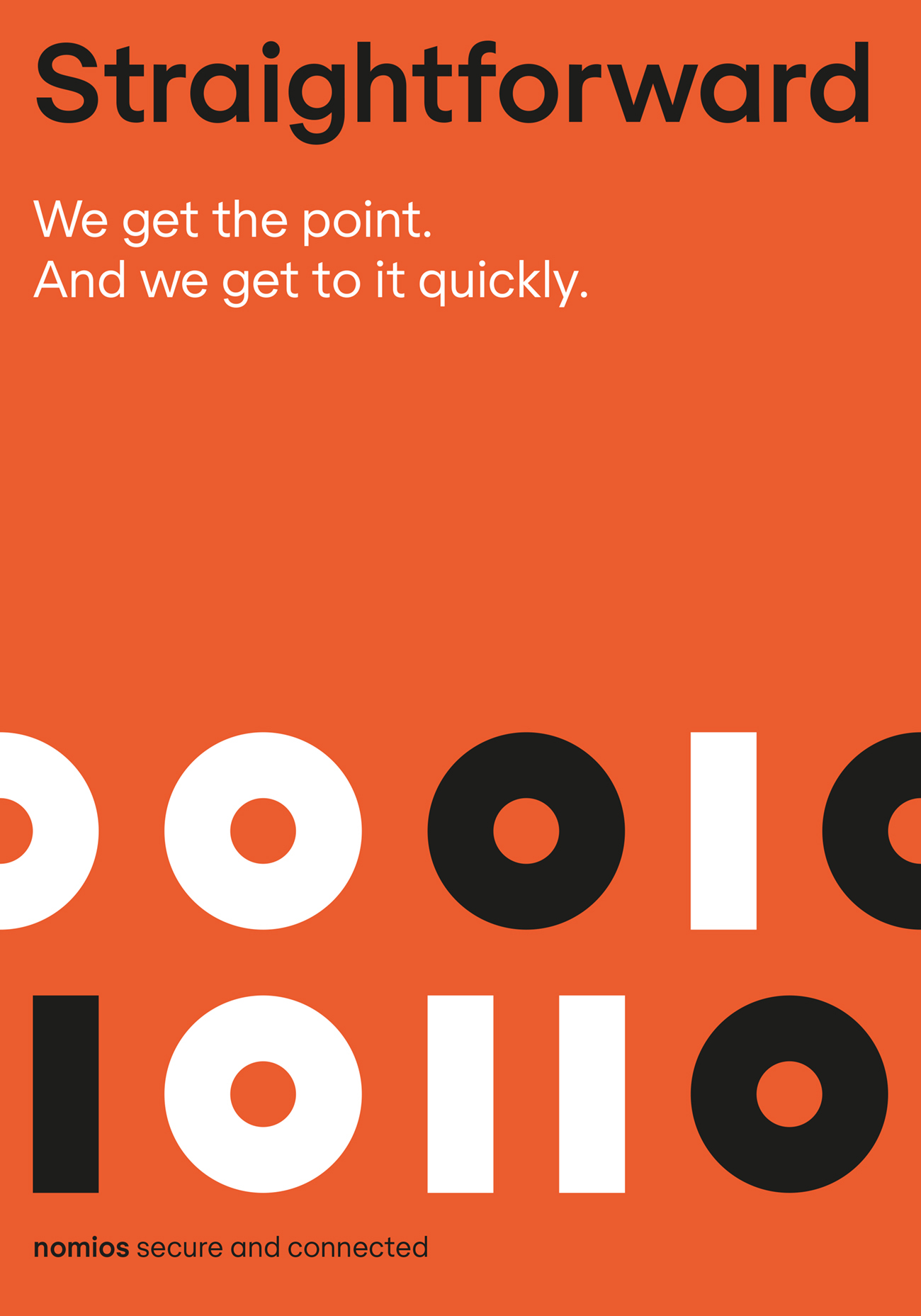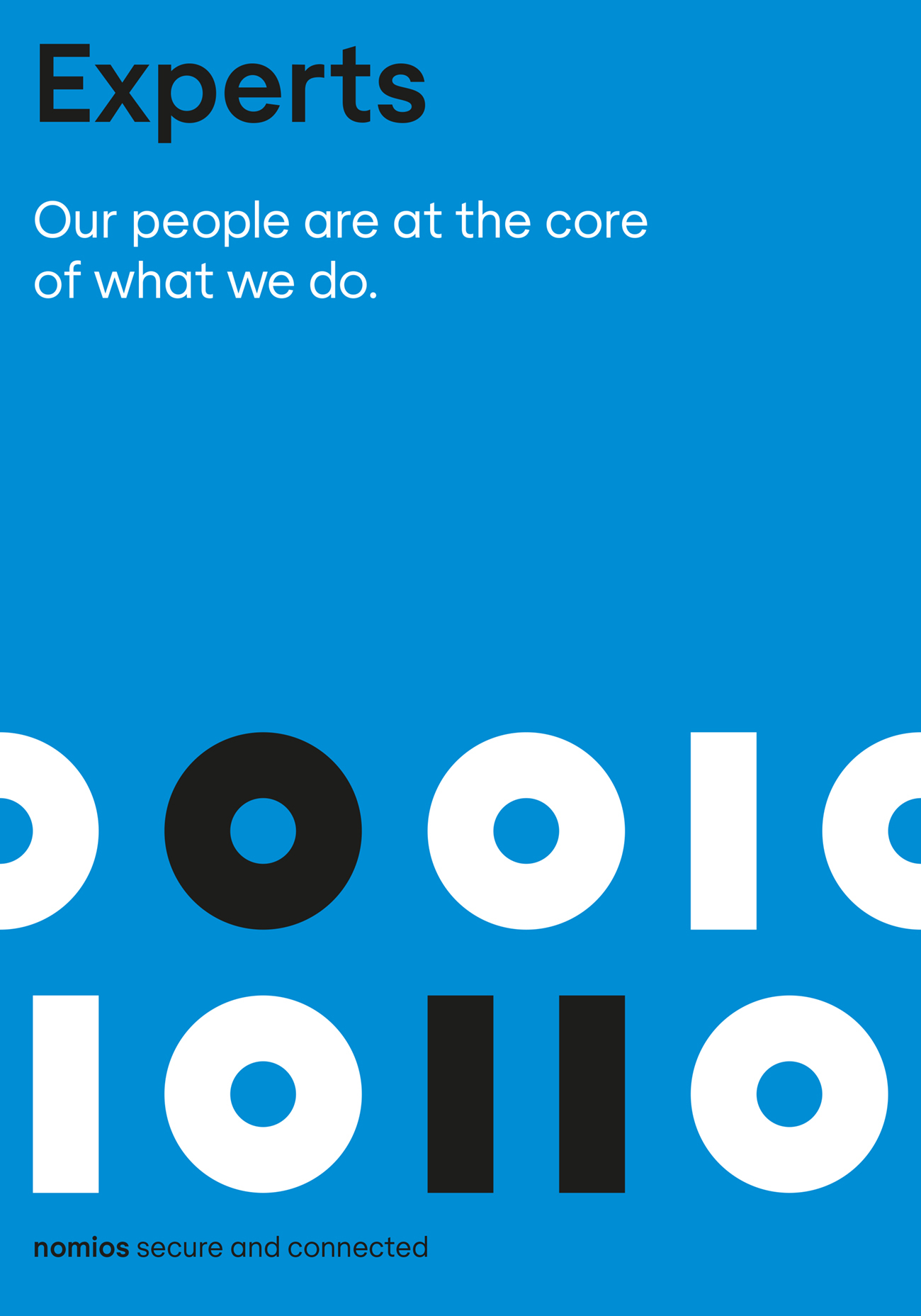 Een kernelement van deze identiteit is binaire code — de basis van digitale communicatie. Dit systeem met twee symbolen pulseert als een energiek ritme, bijna als een beat. Het is ook rechtlijnig — ofwel 1 of 0 en niets ertussenin. De binaire code benadrukt het technische DNA van Nomios en haar mensen.