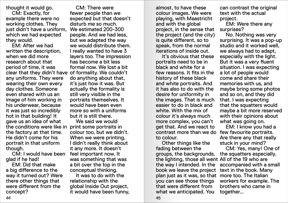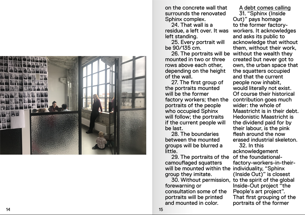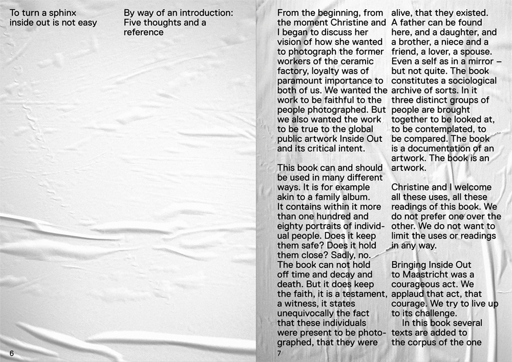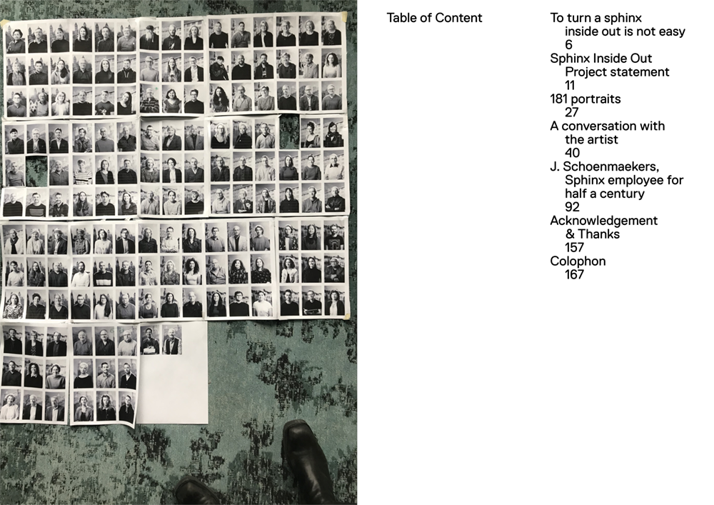 Dit boek is een eerbetoon aan de geschiedenis van het Sphinxerfgoed en de stad Maastricht zelf. De fotoportretten vertegenwoordigen voormalige werknemers van de keramiekfabriek, krakers die de gebouwen bezetten na de sluiting van de fabriek en mensen die nu in het herontwikkelde complex werken. De portretten zijn gemaakt door kunstenaar Christine Munz. Sphinx Inside Out is geïnspireerd op het mondiale kunstproject van kunstenaar en activist JR. De portretten werden op groot formaat geprint en aan de muren van de Sphinx-fabriek opgehangen. Het project liep van juni tot en met 31 augustus 2019. Het boek is verkrijgbaar via The Artist and The Others.